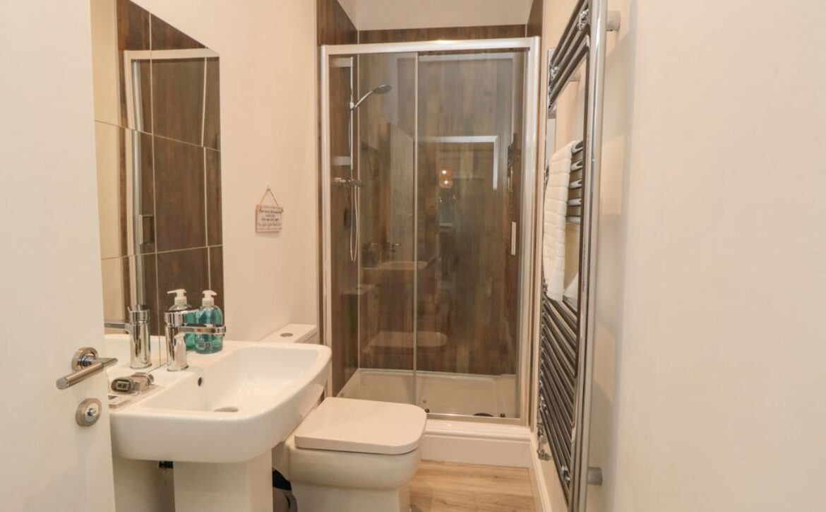 - Ground-floor shower room with walk-in shower, basin, heated towel rail, and WC