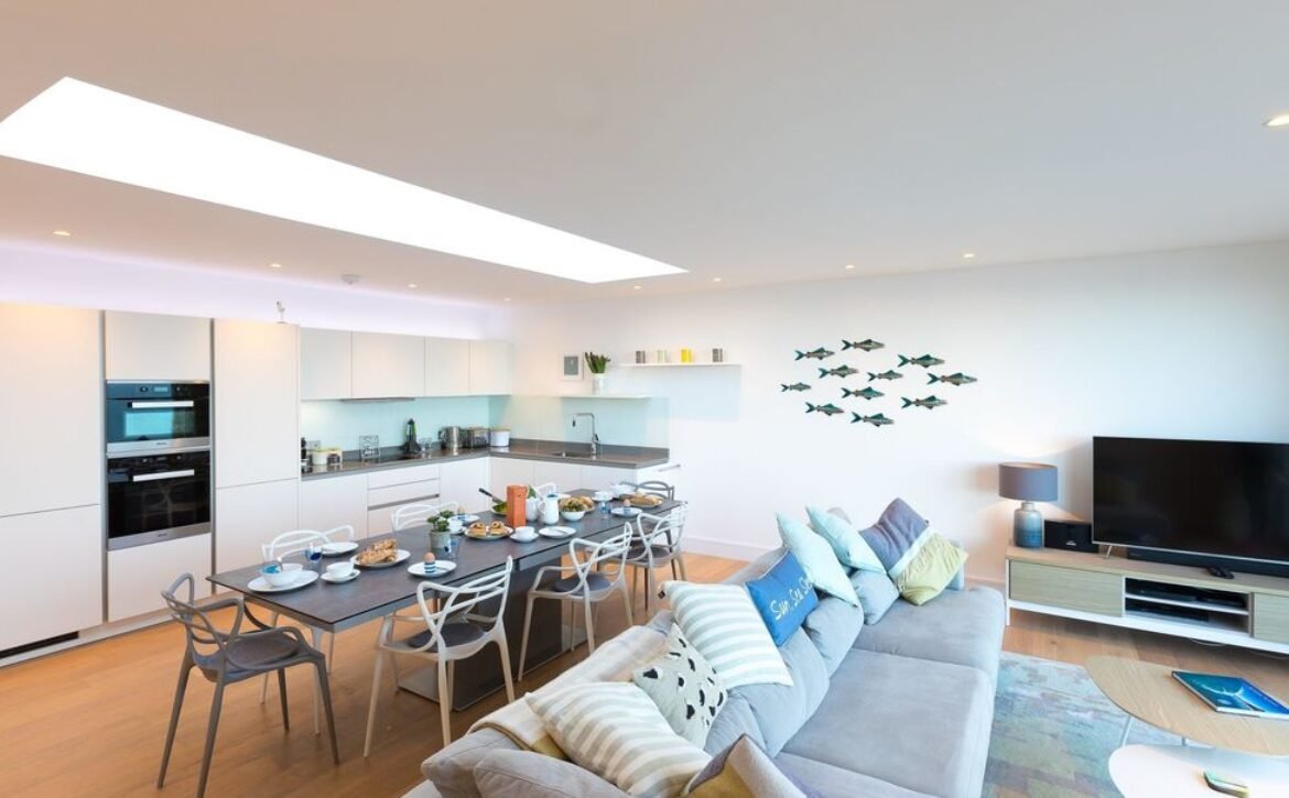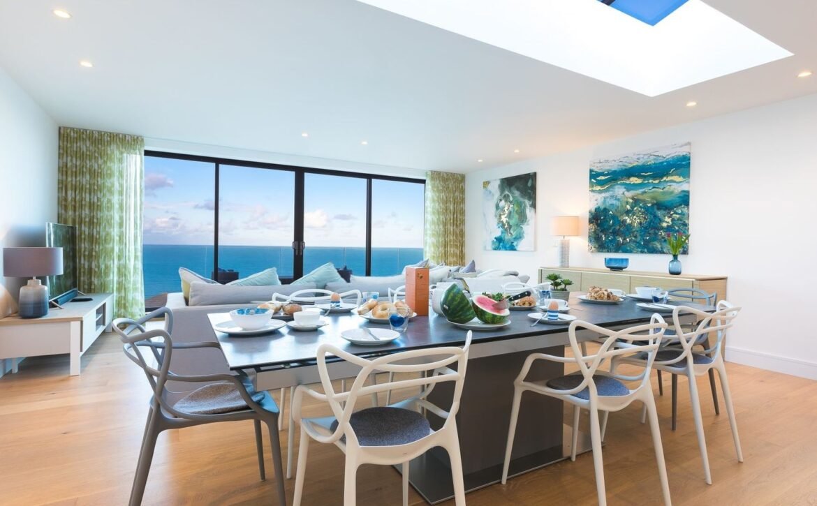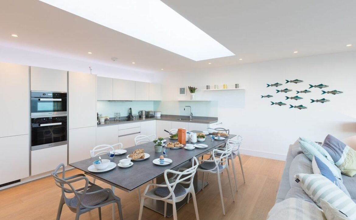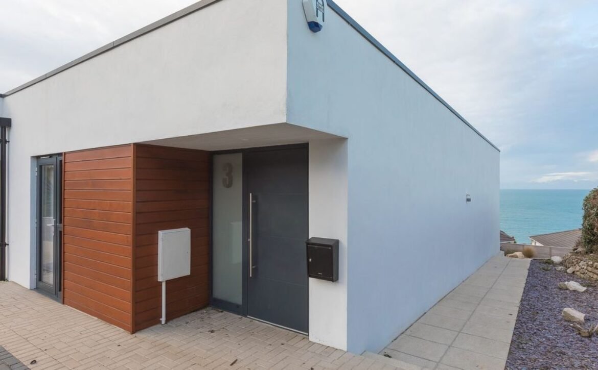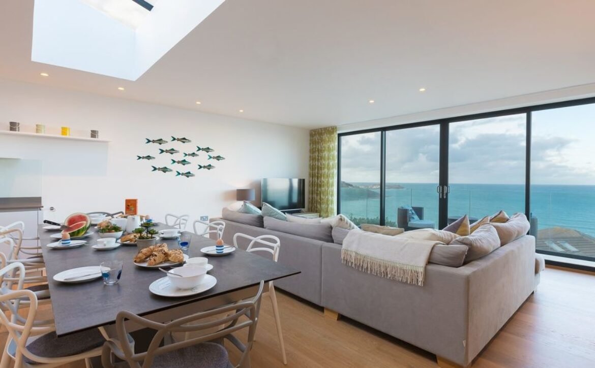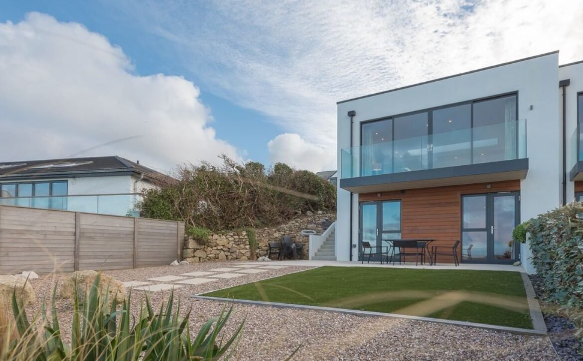 Seaview PropertyPerfectly positioned overlooking St Ives Bay, at Sandsifters, a contemporary three villa development, in Carbis Bay, near the scenic railway, close to the beach and access to the South West coast path, this stylish, reverse-level, three bedroom villa, is ideal for a large family, the two stunning outside spaces, a frameless first floor balcony and a private ground floor garden terrace, boasting panoramic views of the bay, stretching across Carbis Bay Beach out to St Ives, its clever open plan design capturing this picture postcard view, through the floor to ceiling living area glass doors onto the balcony, throughout the whole space, including the open plan kitchen and dining area, roof lighting cleverly channels the natural daylight to shine through, illuminating the oak floors, underfloor heating runs through the property, keeping your toes toasty what ever the time of year, if you can tear yourself away from the natural beauty outside, snuggle up on the large sofa, seating six, indulge in the ultimate entertainment package with a 55” Samsung UHD television with full Sky package, including Cinema and Sports, a dining area and open plan kitchen are ideally placed within the living area perfect for socialising with the chef, a large Calligaris Ceramic dining table, comfortably seating eight people, provides the centre piece, it is perfectly positioned to maximise the views, a contemporary German kitchen, comprising of white handleless units teamed with grey Silestone work tops, is well-appointed with everything a chef needs and more, a separate utility room is located off the main entrance hallway on the first floor, the kids will love their own space to escape and if you want to hide away too, the ground floor TV Lounge offers the perfect space, a sofa and a large screen television, with the same Sky package as the living area, is ideal for gaming or watching sport, the master and second bedroom are located on the ground floor, with a third rear bedroom on the first floor, the ground floor bedrooms enjoy access to a seaward facing private garden terrace, open the door onto the terrace and enjoy an alfresco breakfast in the sun, the views are breath-taking, all three bedrooms offer a private en-suite, the master and third room with a shower and the second room with a bath and shower-over, for your comfort the master and third bedroom offer king sized beds, the second room is fitted with a super king zip and link bed, this can be arranged as twin beds on request, all bedrooms offer plenty of storage space, a W.C.