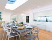 - First-floor open-plan living space with kitchen, dining area and sitting area with balcony