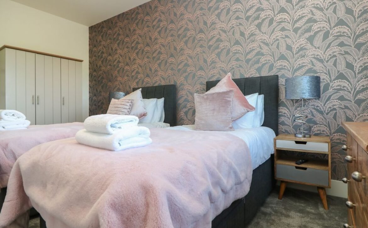 Head up the bespoke staircase and admire the high vaulted ceilings before locating the twin bedrooms, which both offer fantastic storage space, TVs with Freeview and extensive countryside views.