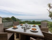 The spacious seaward facing balcony is located on the upper floor and is accessed via the bi-folding living area doors, relax on the patio furniture which comprises of a table and four chairs, perfect for enjoying alfresco meals, the view stretches from the Island in St Ives across the bay to the Godrevy lighthouse, the ground floor patio can be accessed via both bedrooms and offers privacy with two frosted glass screens.