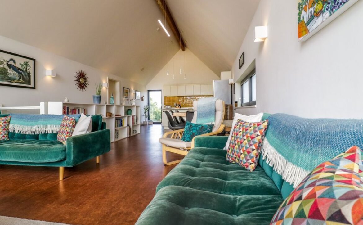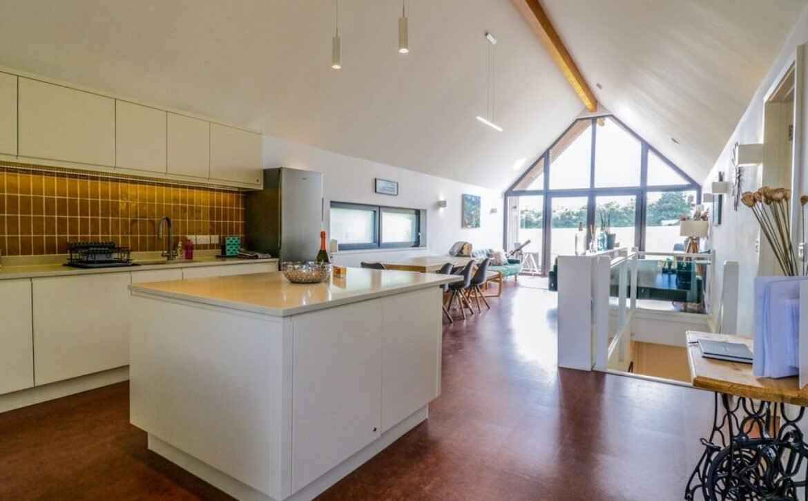 - First-floor open-plan living space with kitchen, dining area and sitting area