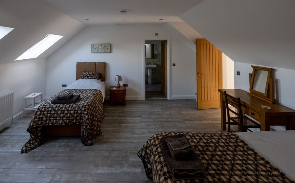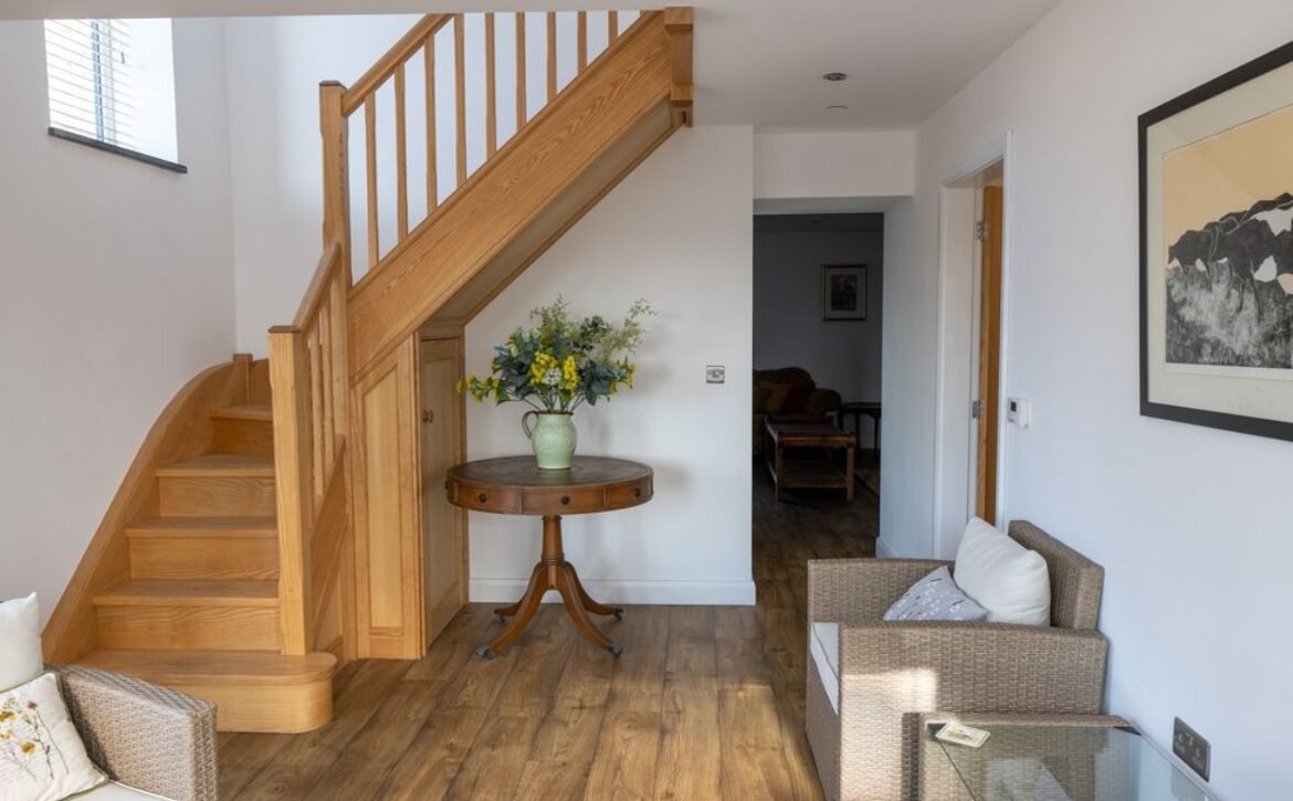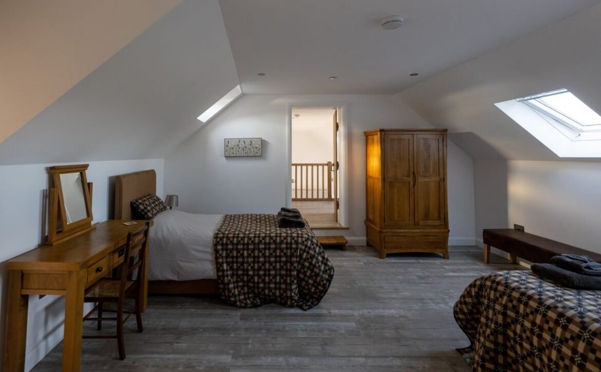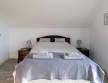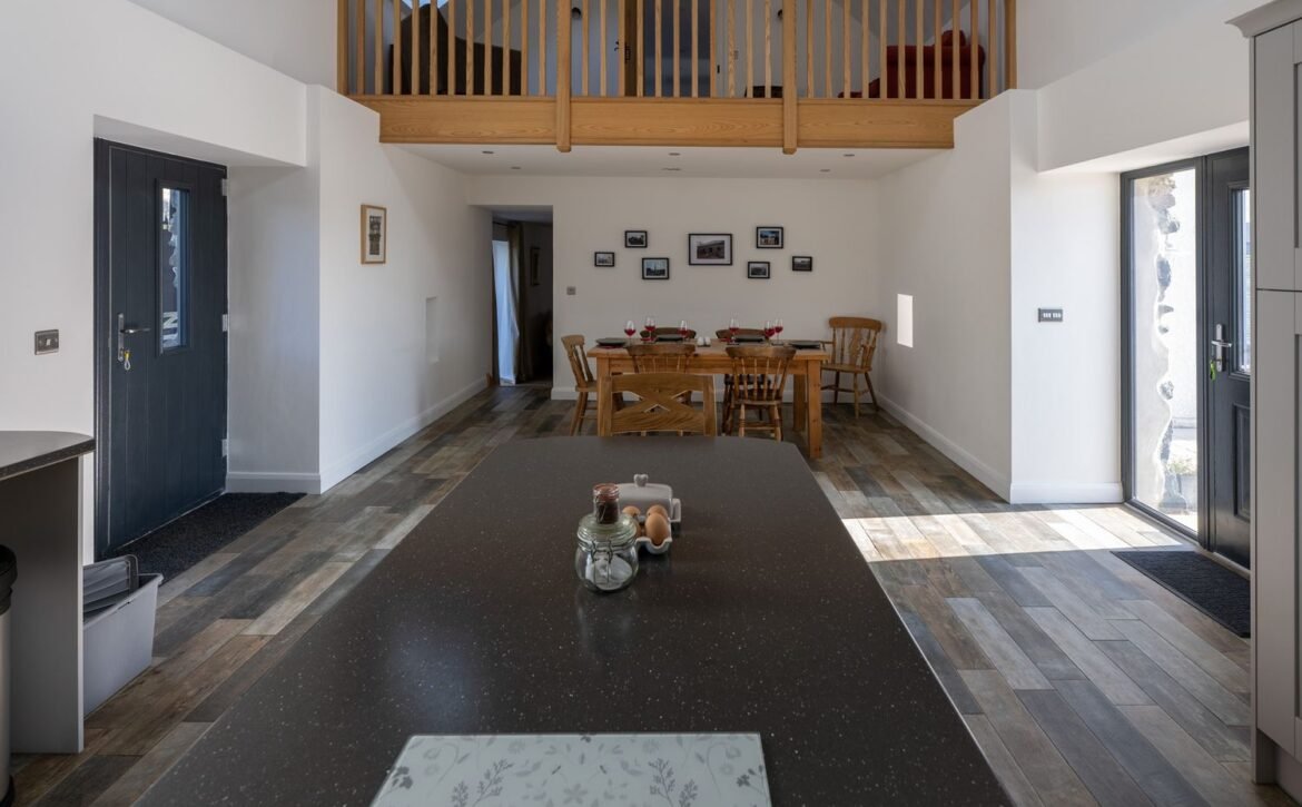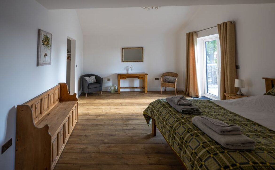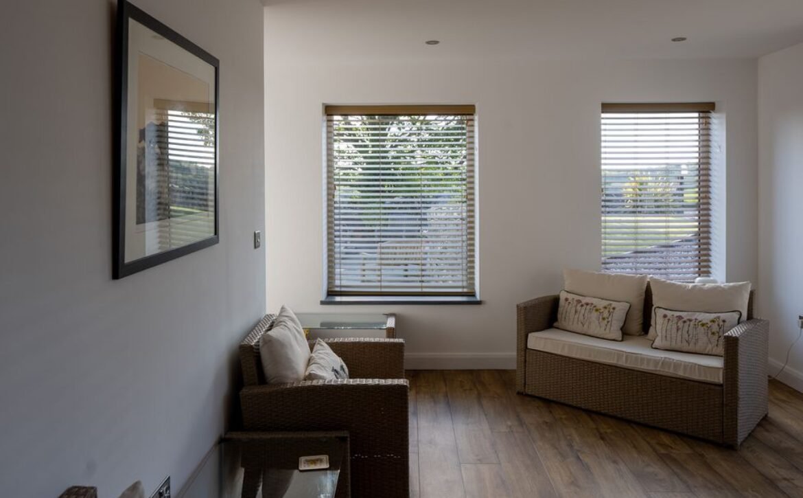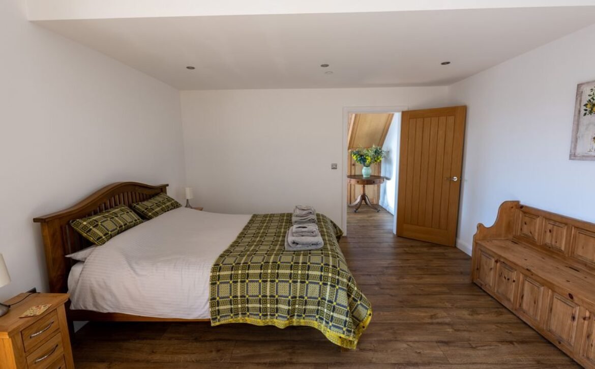 - Three bedrooms: 1 x ground-floor king-size with en-suite walk in wetroom with shower, basin and WC, 1 x first-floor super king-size (zip/link, can be two singles upon request) with mezzanine snug and en-suite roll-top, freestanding bath, walk-in shower, basin and WC, 1 x first-floor king-size with Juliet balcony and en-suite bath, basin and WC