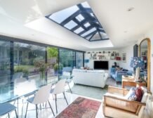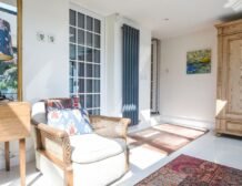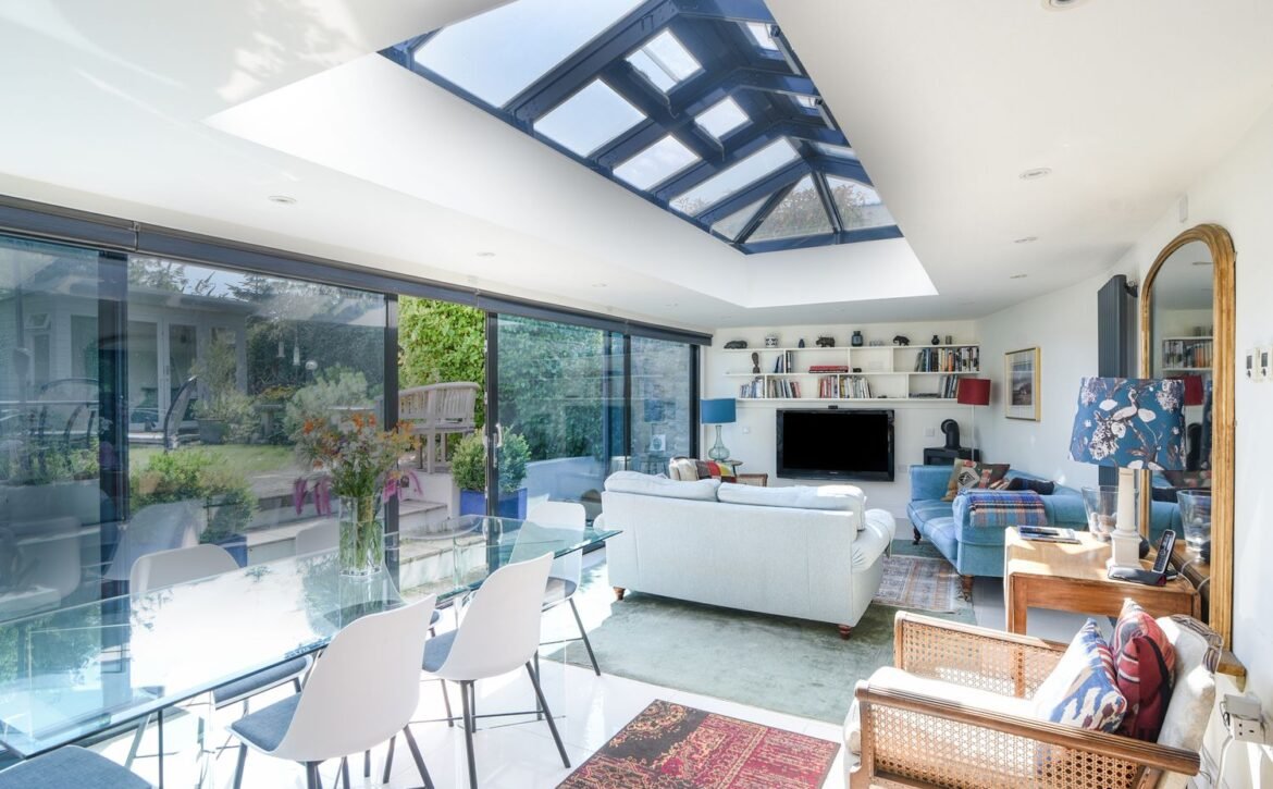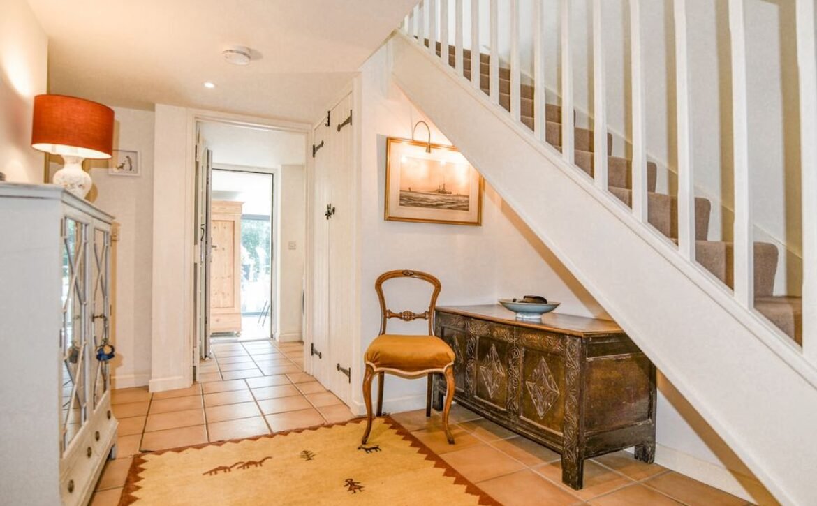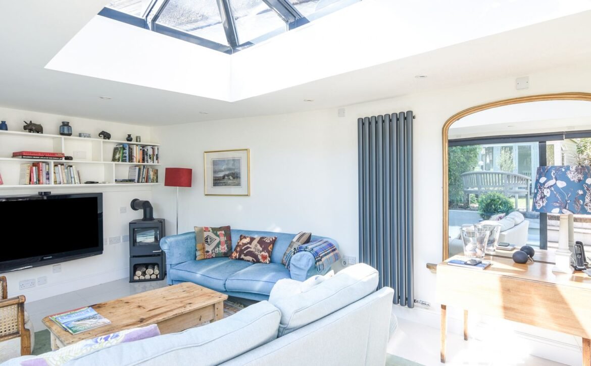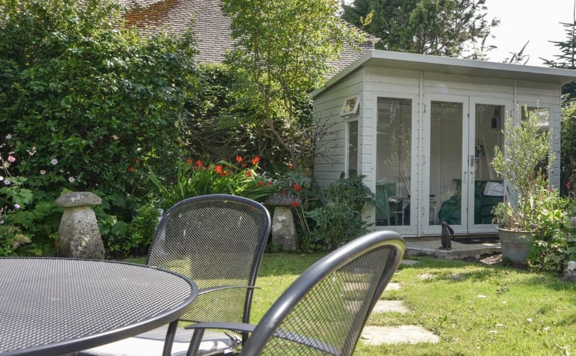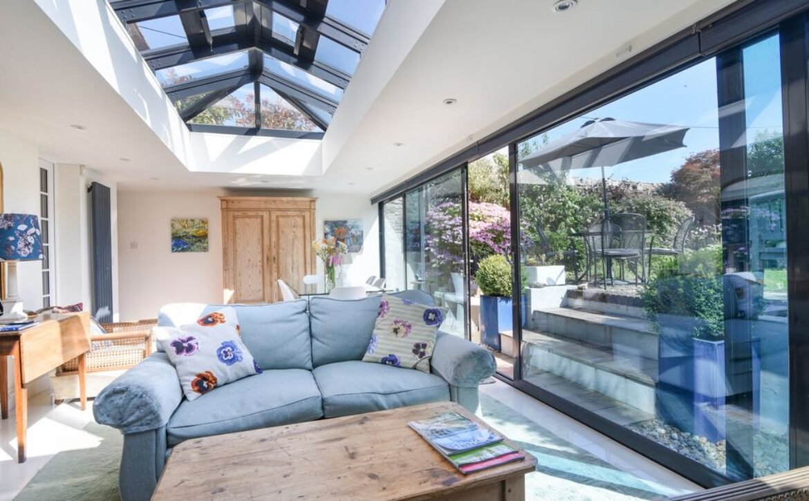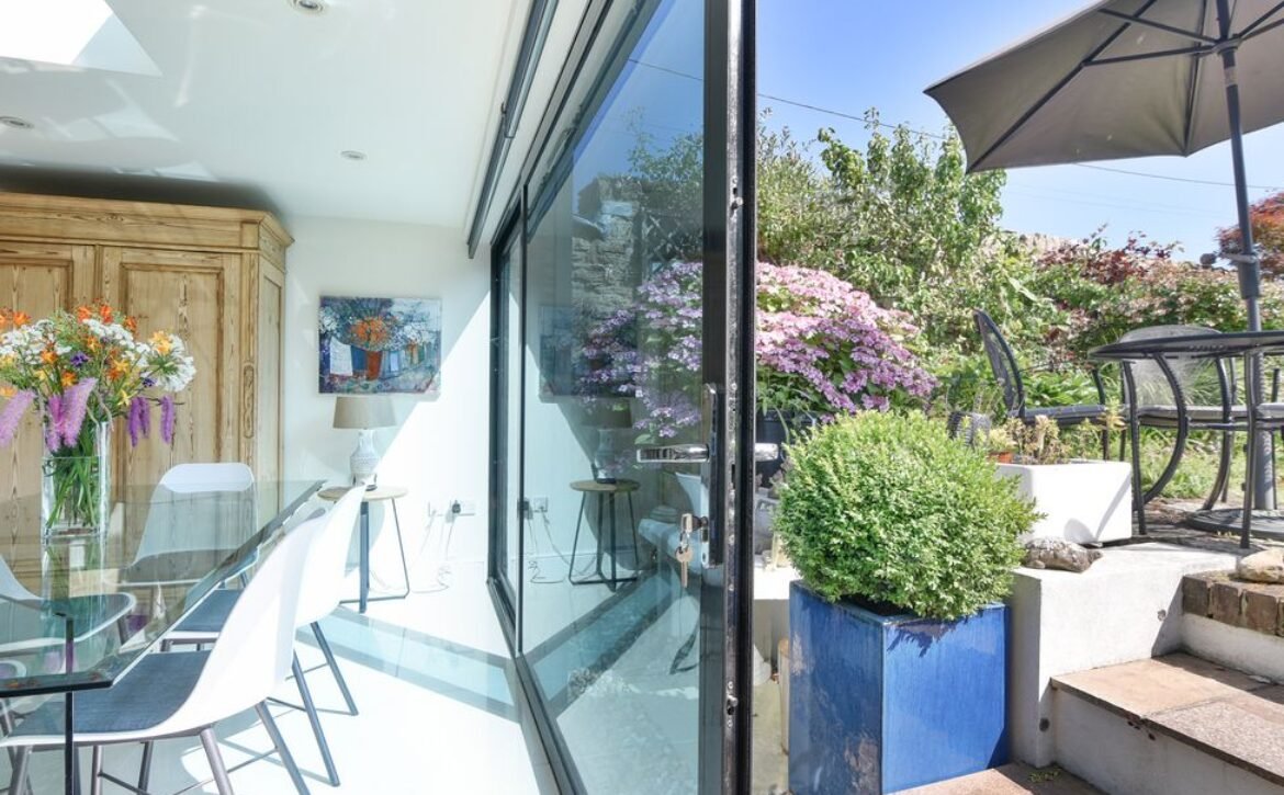 The large sliding doors open onto the south facing walled garden with mature trees and colourful cottage style planting.