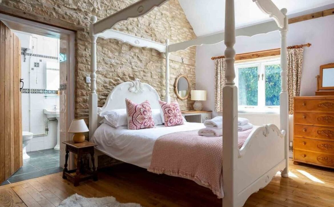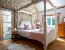 The master bedroom is a delightful room which contains a wonderful four-poster king size bed, has striking exposed Cotswold feature wall, high vaulted ceilings and boasts an en-suite shower room with a large walk-in rain shower to enjoy an invigorating shower in.