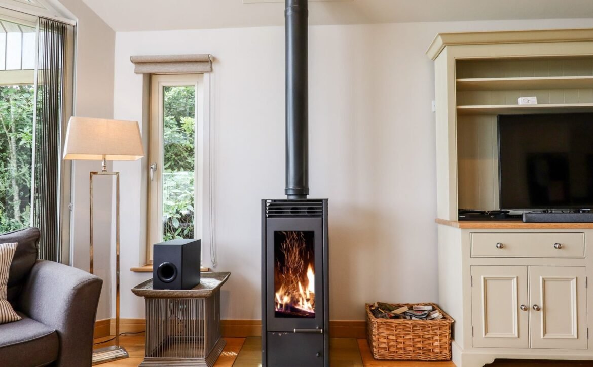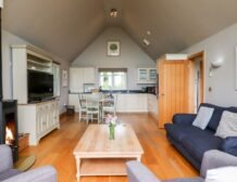 - Open-plan living space with kitchen, dining area and sitting area with woodburning stove