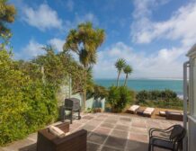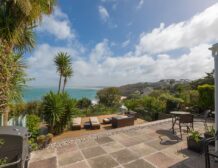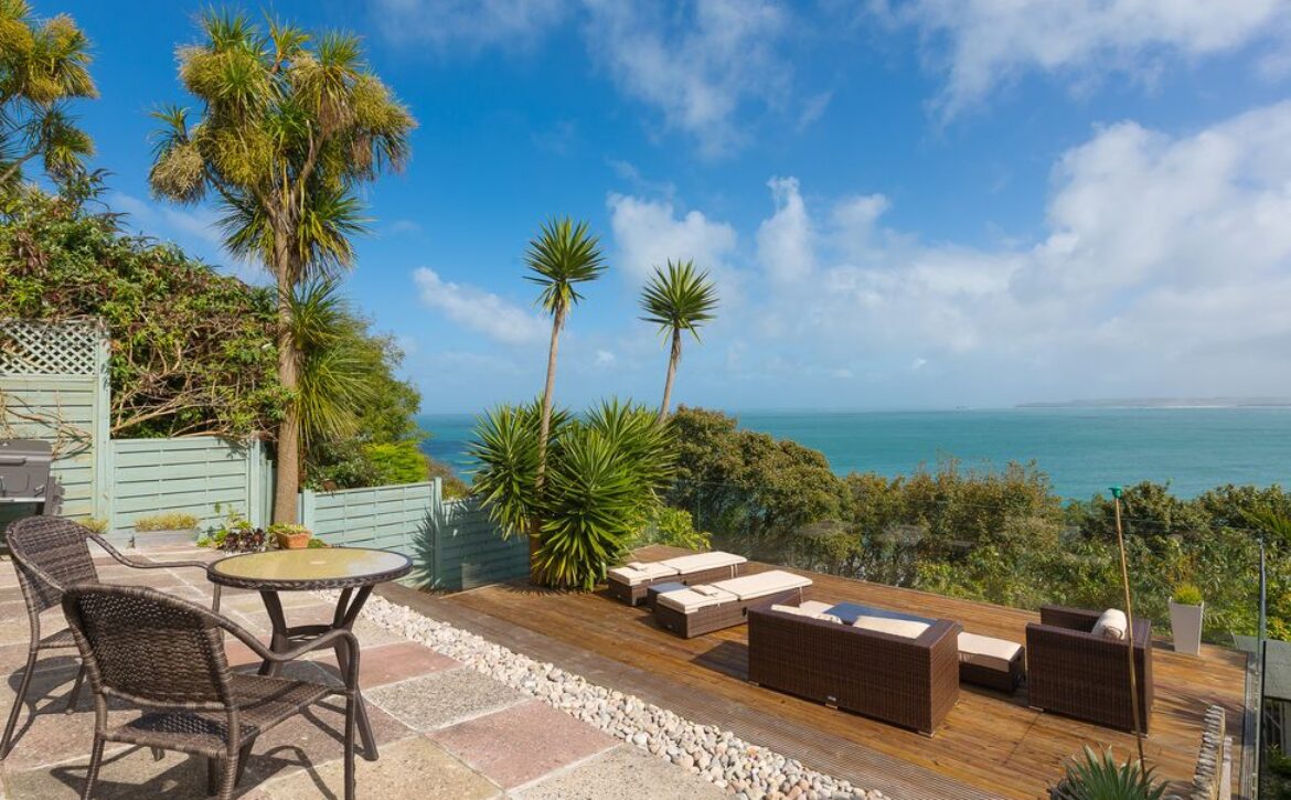 The decked seaward facing sun terrace leading from the conservatory has a matching set of rattan table and four chairs, a two-seat sofa and two chairs, two sun loungers and footstools.