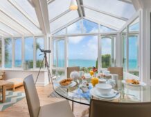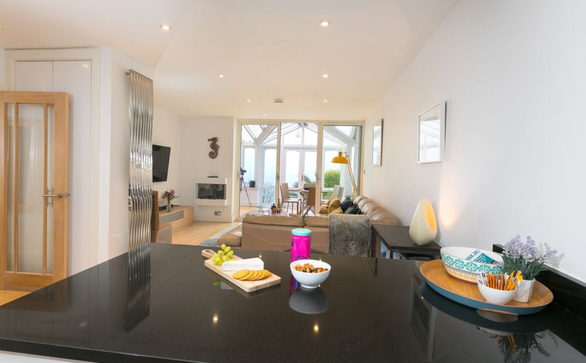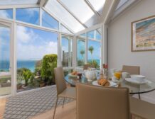 A spacious open plan kitchen, dining and sitting area, extended by a modern conservatory all enjoy wonderful ocean views.