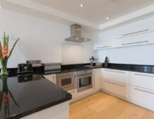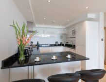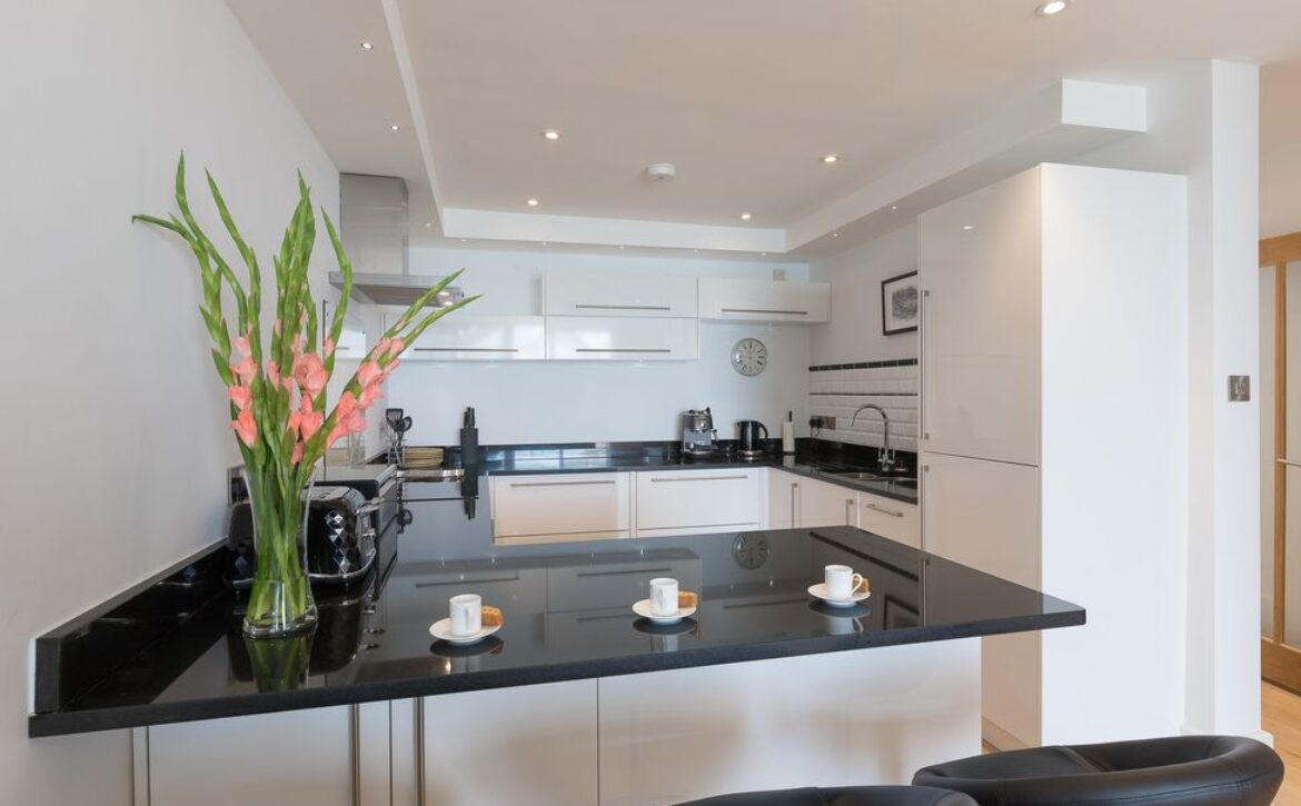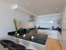 An open plan well-appointed kitchen, within the living area, with black granite work top and breakfast bar offers everything you need.