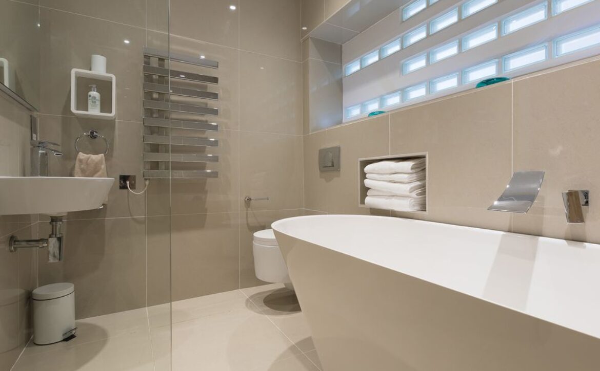 - Family bathroom with bath, shower, basin, heated towel rail, and WC
