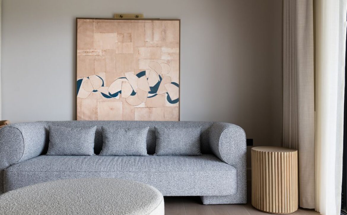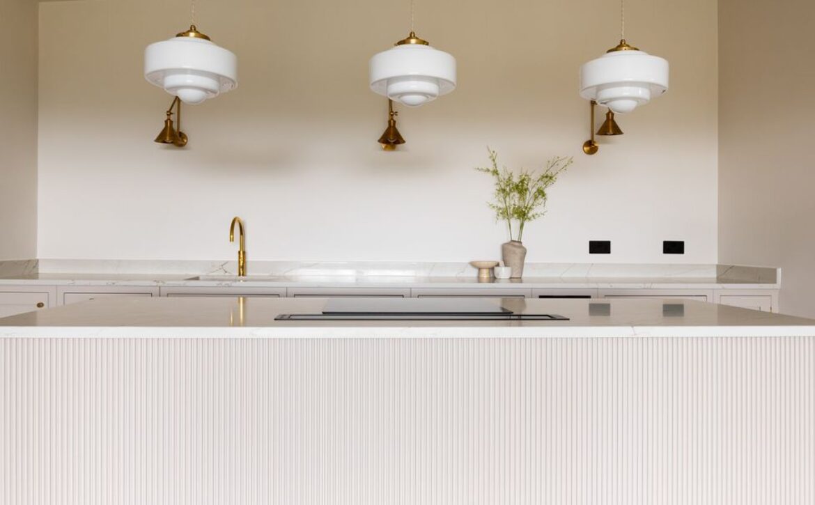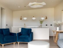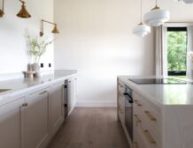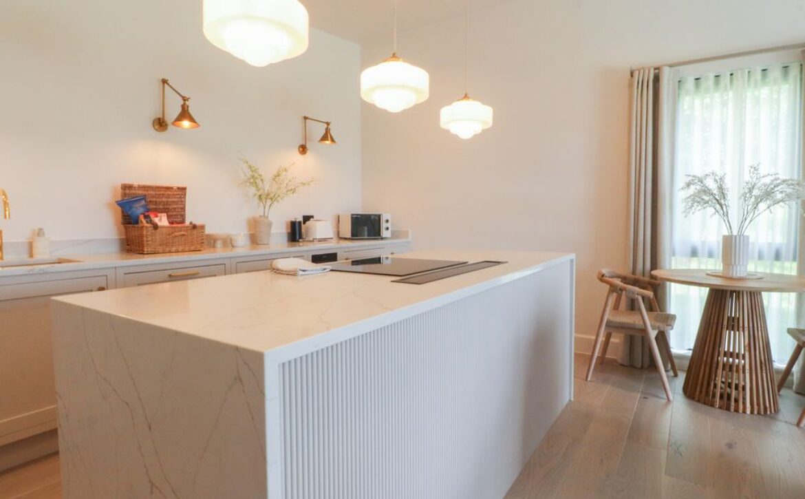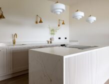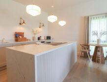 Inside, you’ll find high-quality fixtures and a lavish interior, featuring handmade kitchen with Quartz countertops, Quooker boiling water tap, an island with a waterfall top, and original artwork.
