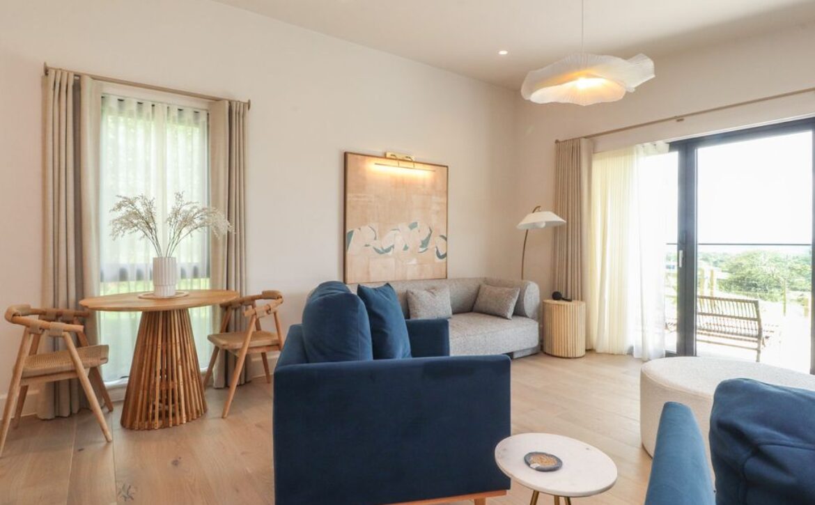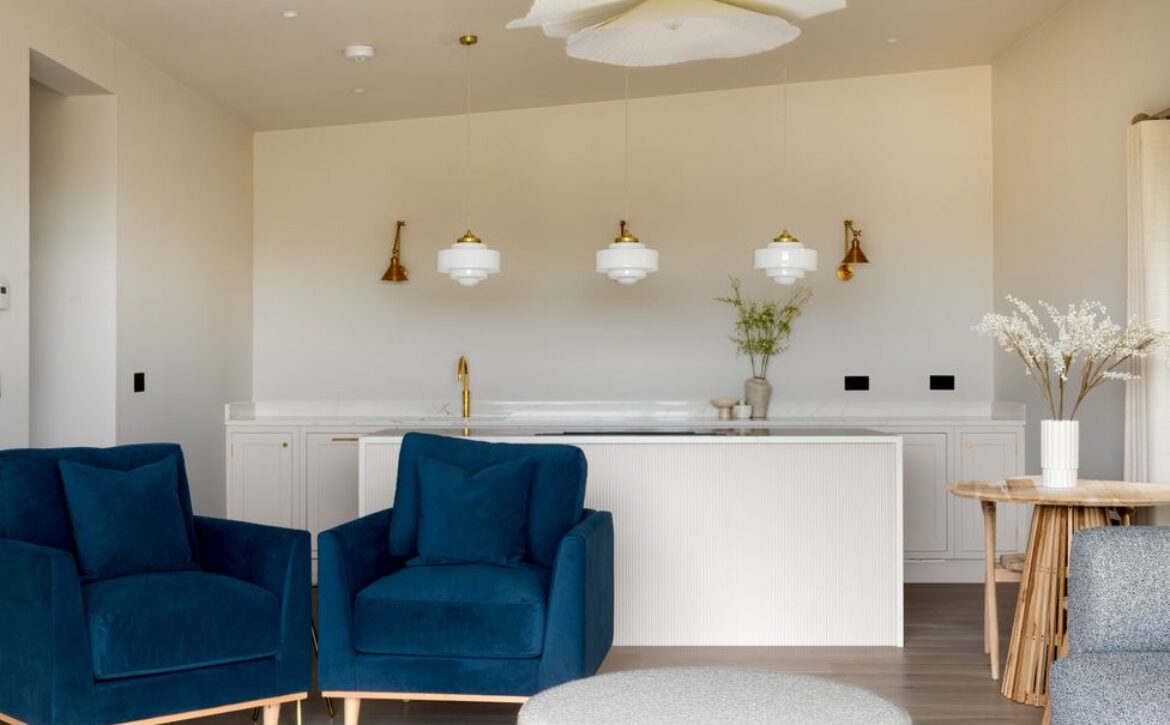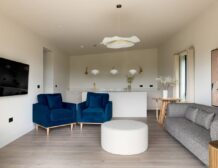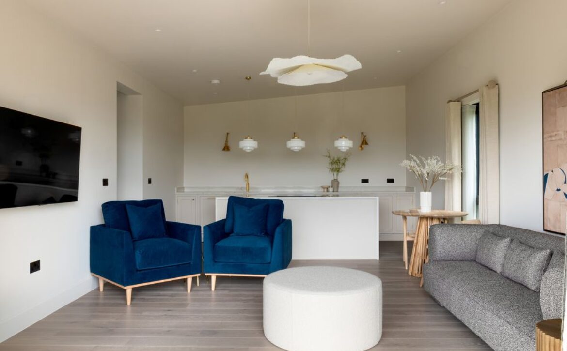 The open-plan living area exudes elegance with underfloor heating, plush seating, and a Smart TV, creating a stylish and comfortable space.