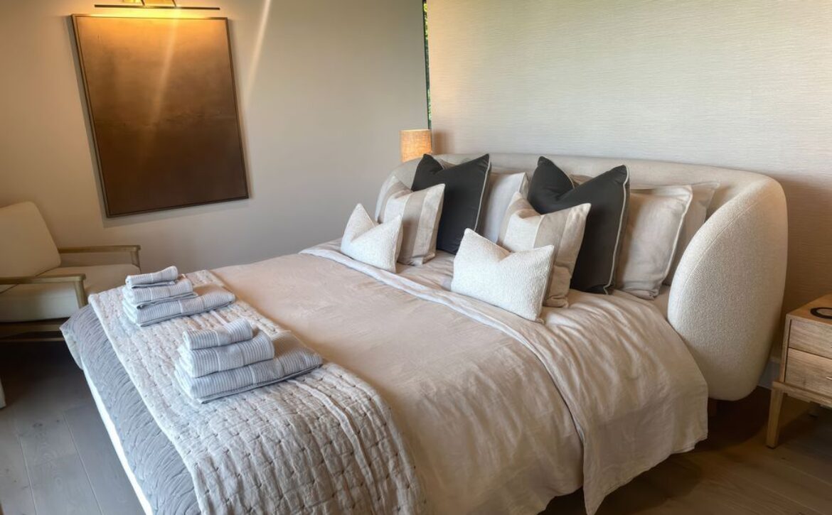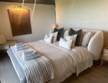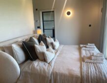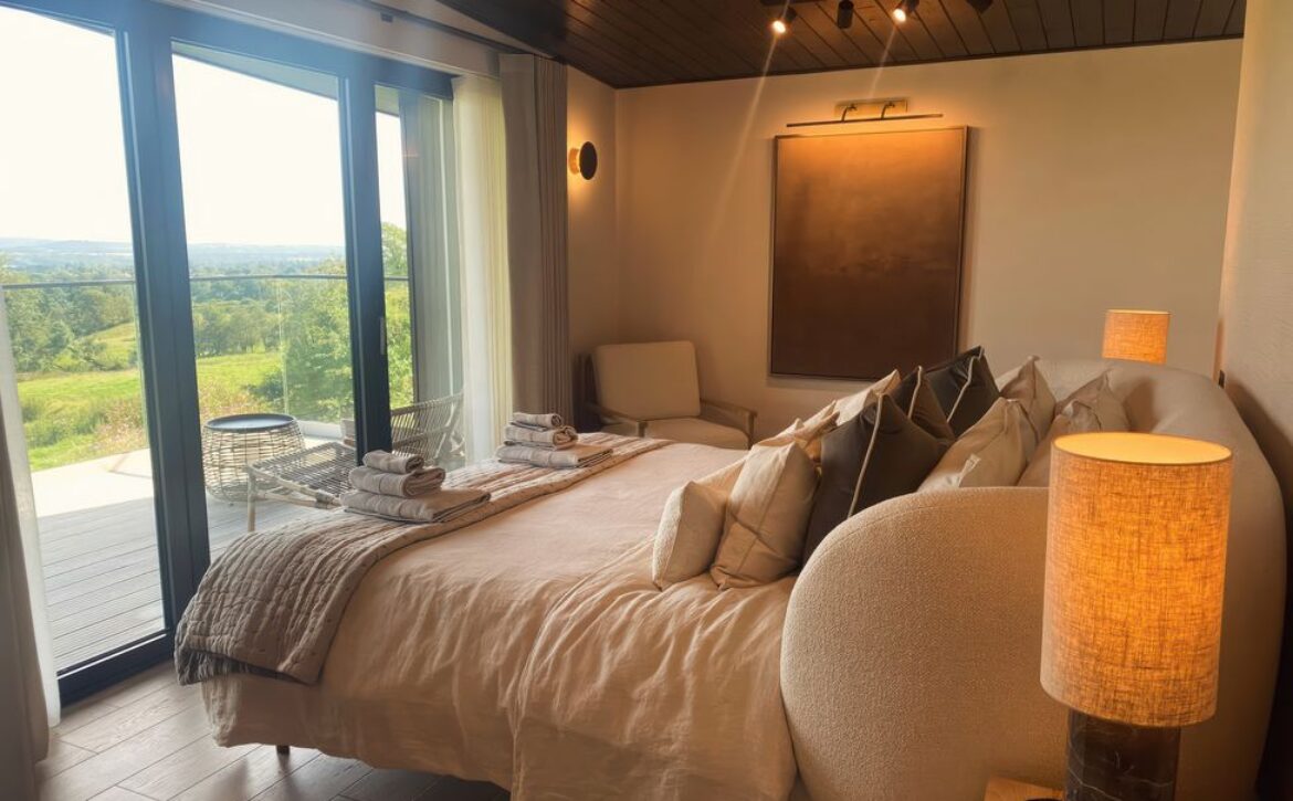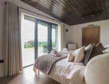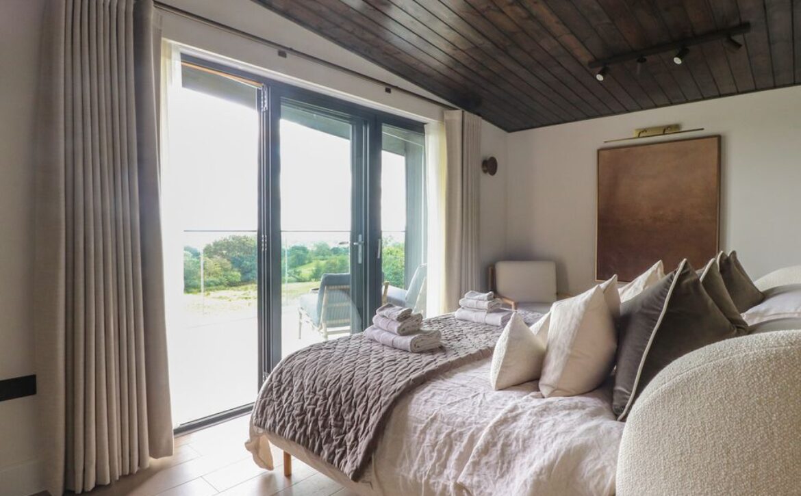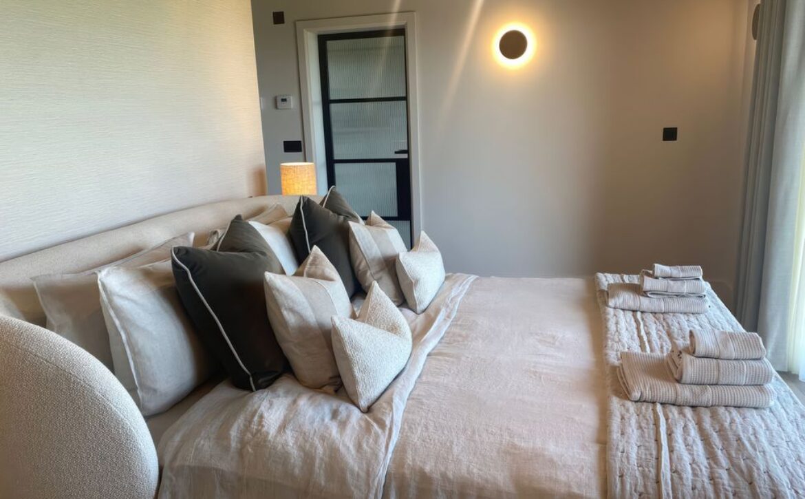 The light and airy super king-size double bedroom offers a spacious layout, stylish furnishings, and a dressing area for added luxury with robe and slippers provided.