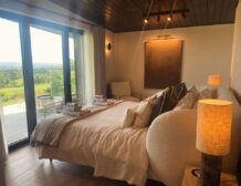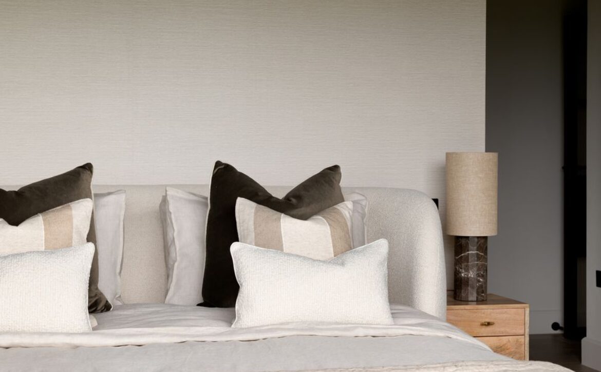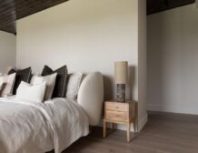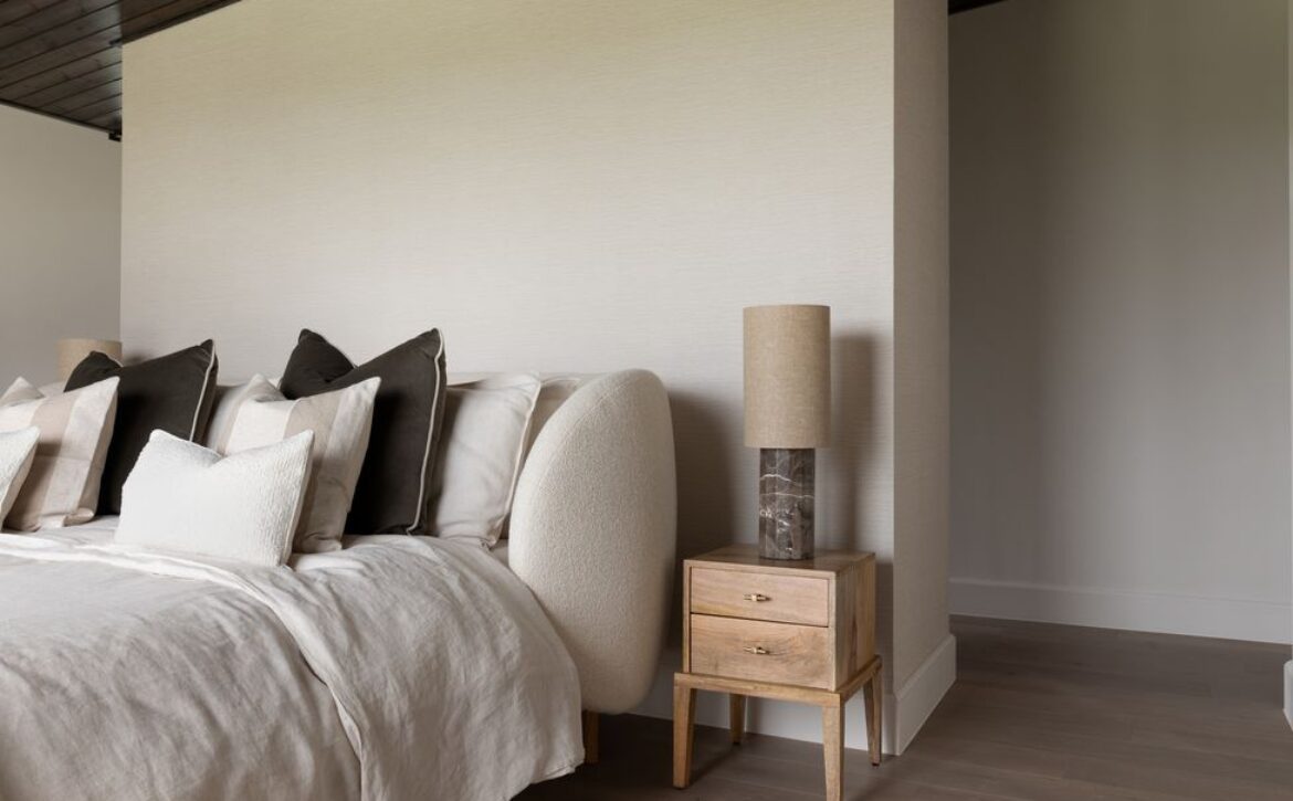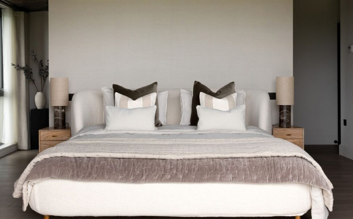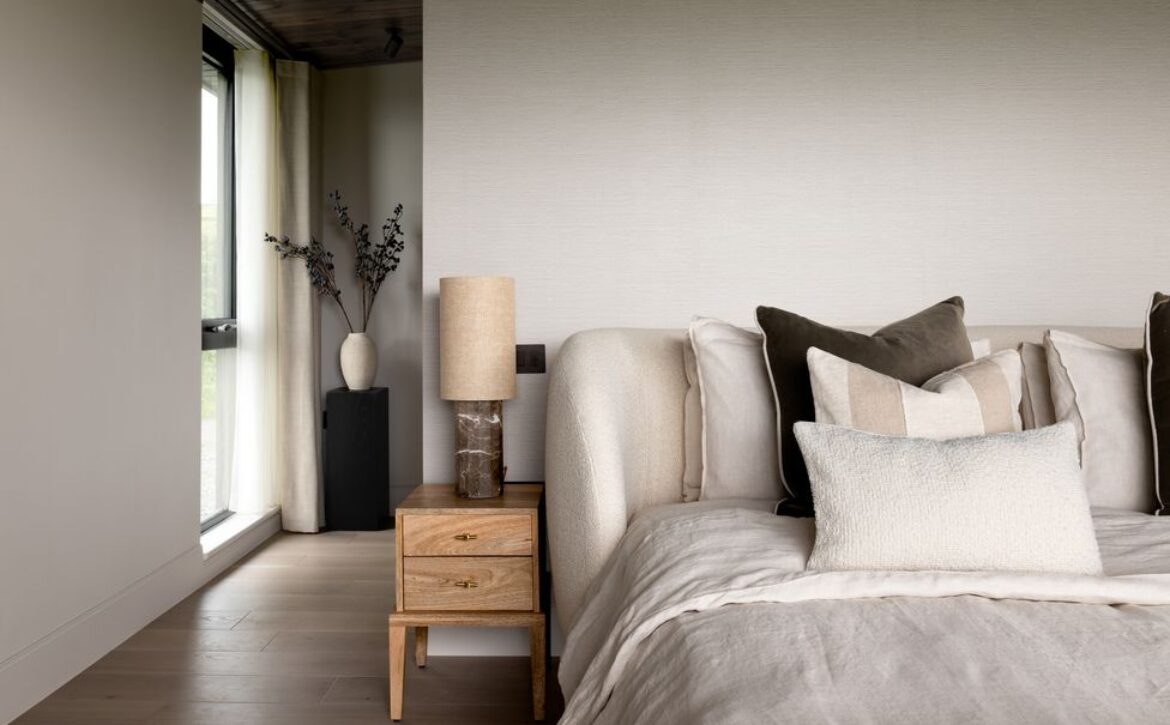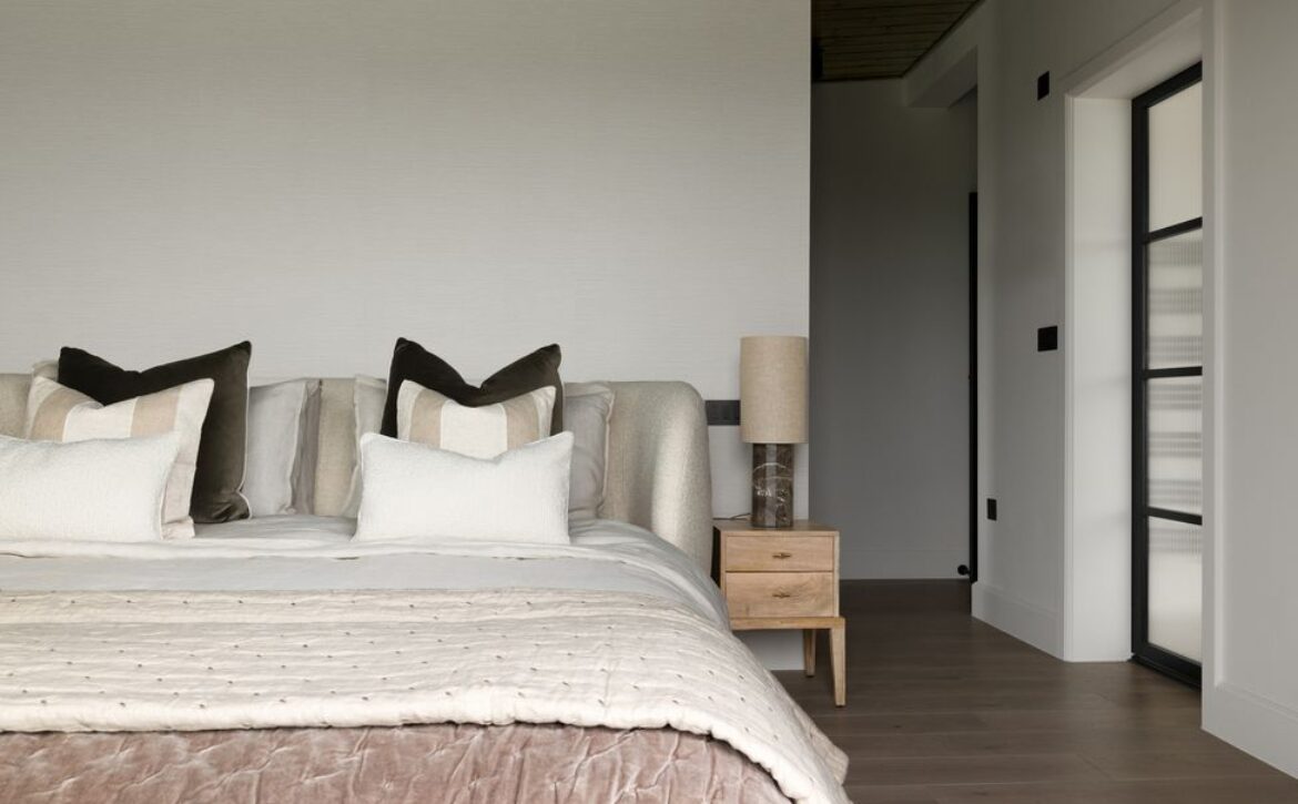 The light and airy super king-size double bedroom offers a spacious layout, stylish furnishings, and a dressing area for added luxury with robe and slippers provided.