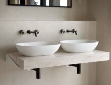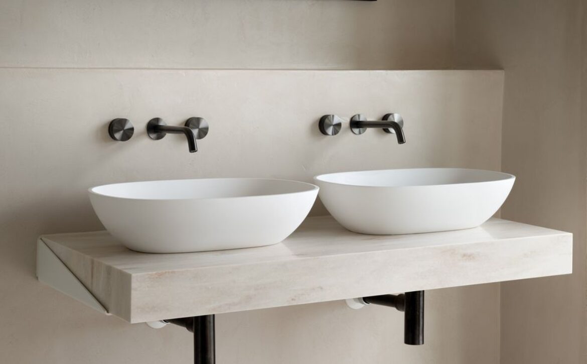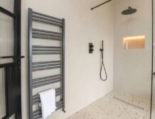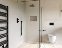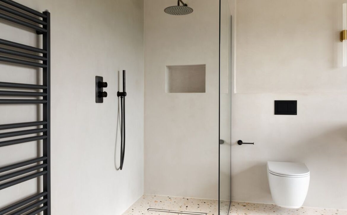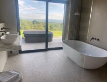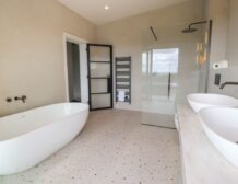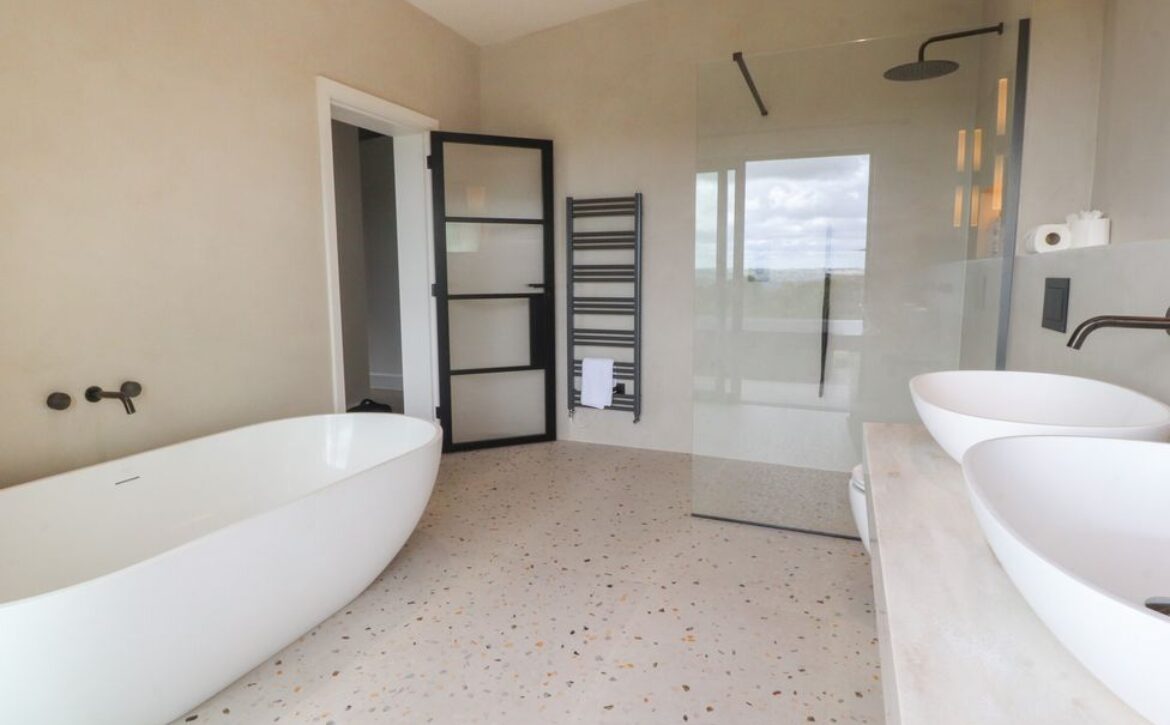 The beautiful, contemporary bathroom features a freestanding stone bath, a separate walk-in shower, twin basins, and terrazzo flooring, creating a haven for relaxation.