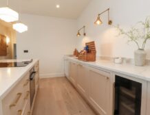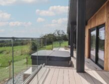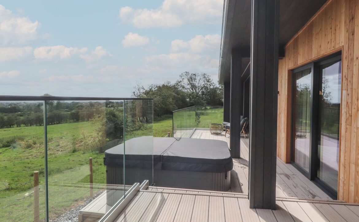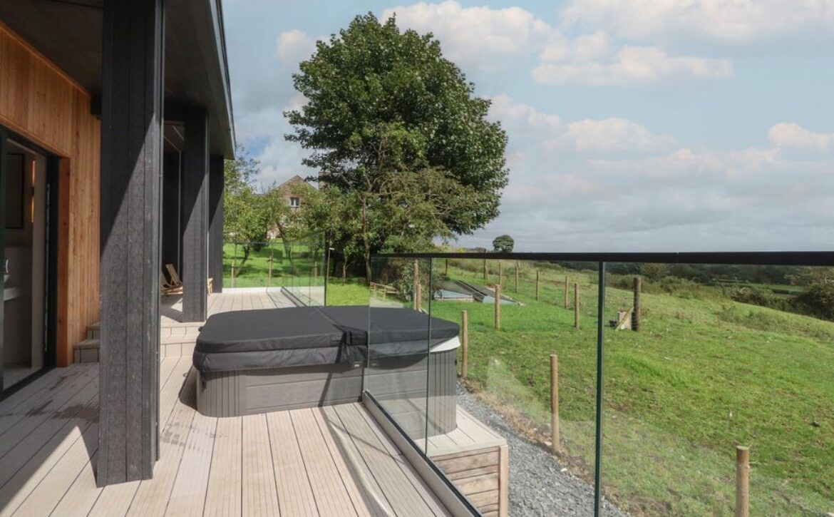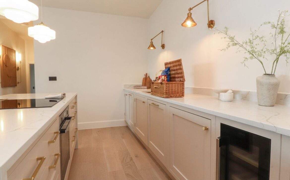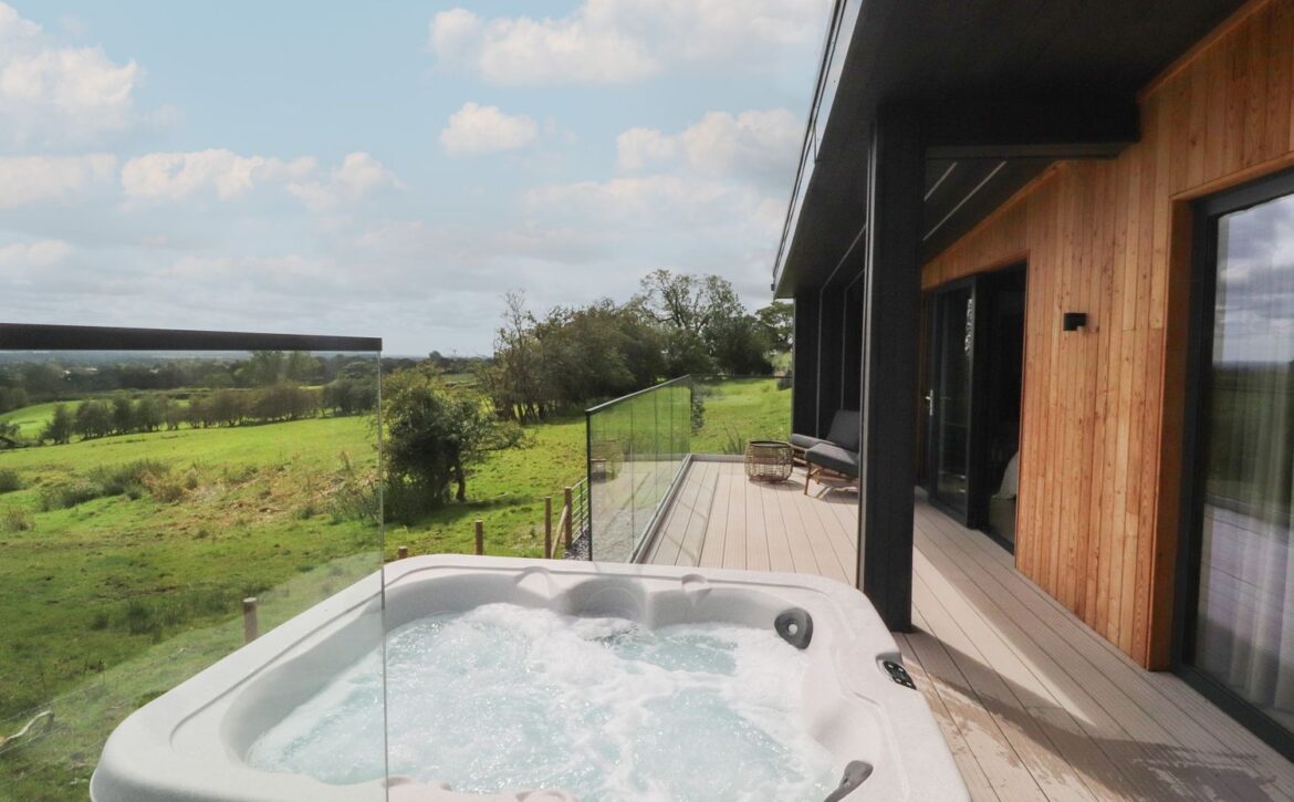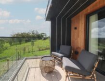 The modern kitchen and dining area are equipped with all the necessary appliances for a convenient self-catered stay, whilst bifold doors open to the decking for alfresco dining, before an indulging moment in the infinity hot tub.
