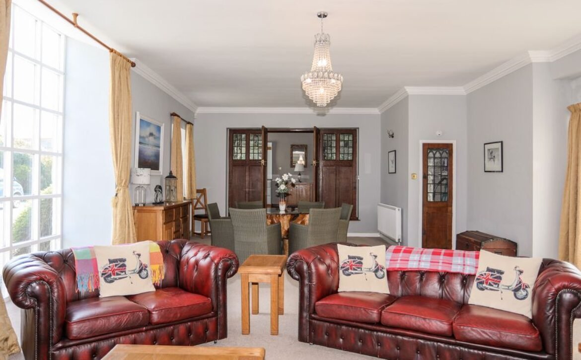 Heading under the bell tower topping the house, salvaged from a shipwreck in Anglesey in 1853, enter into the lofty hallway and kick off your boots before heading into the spacious sitting room where you can all gather together before the woodburning stove, relaxing on the arrangement of sofas or gathering around the table with its feature woodwork base, as you toast to your terrific holiday.