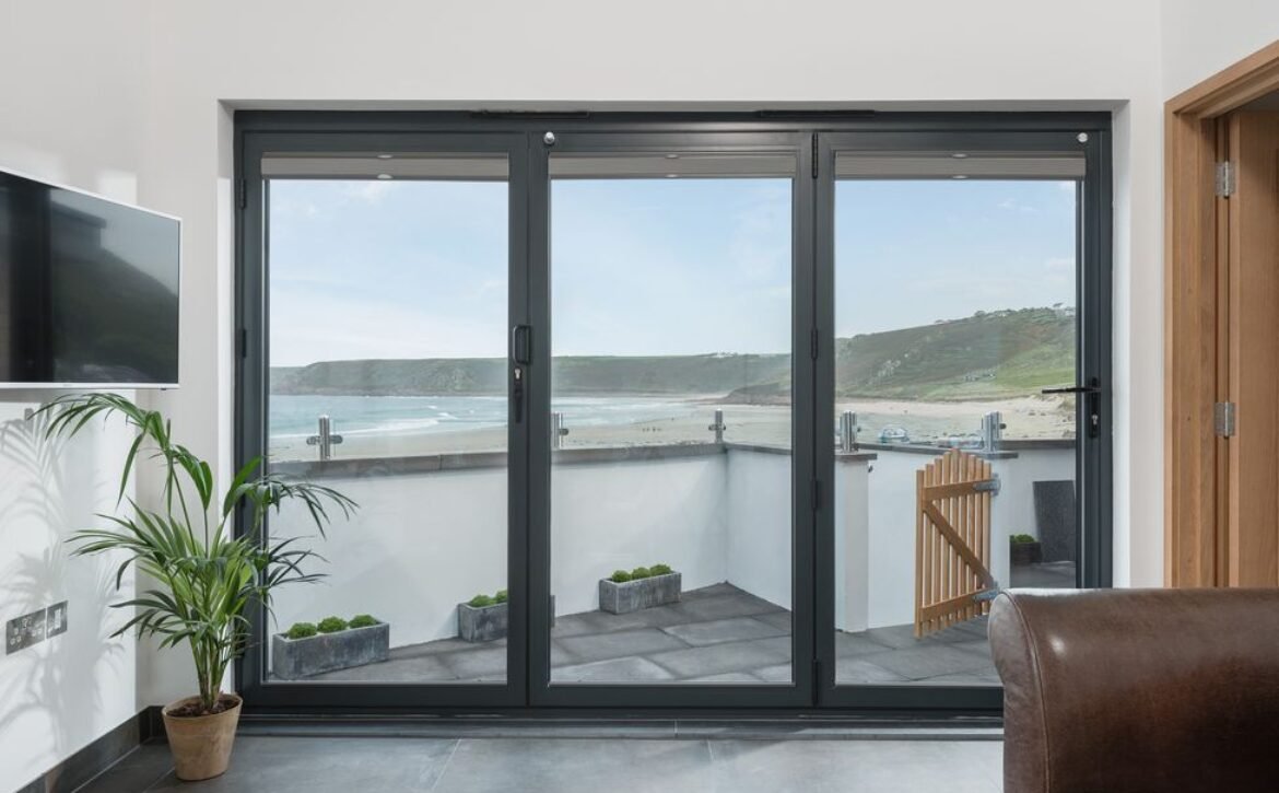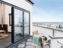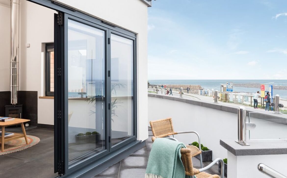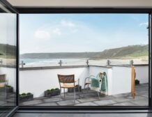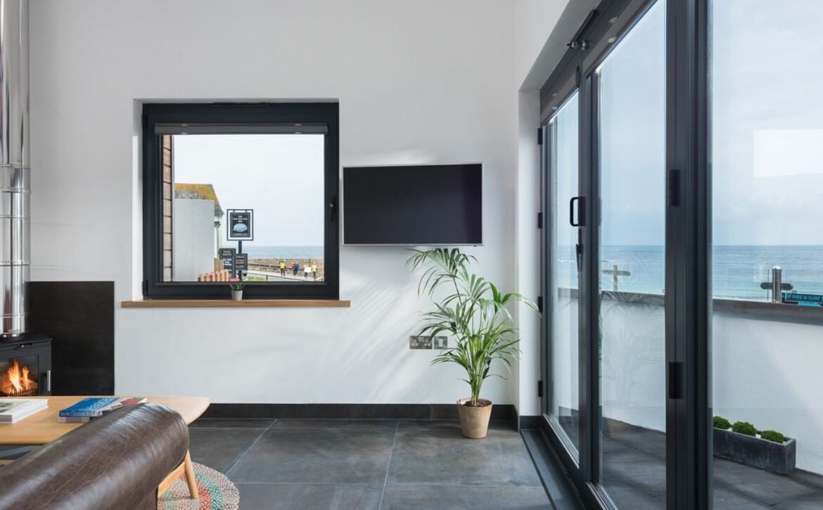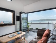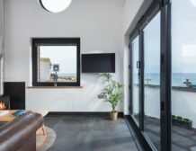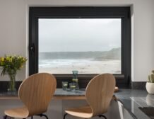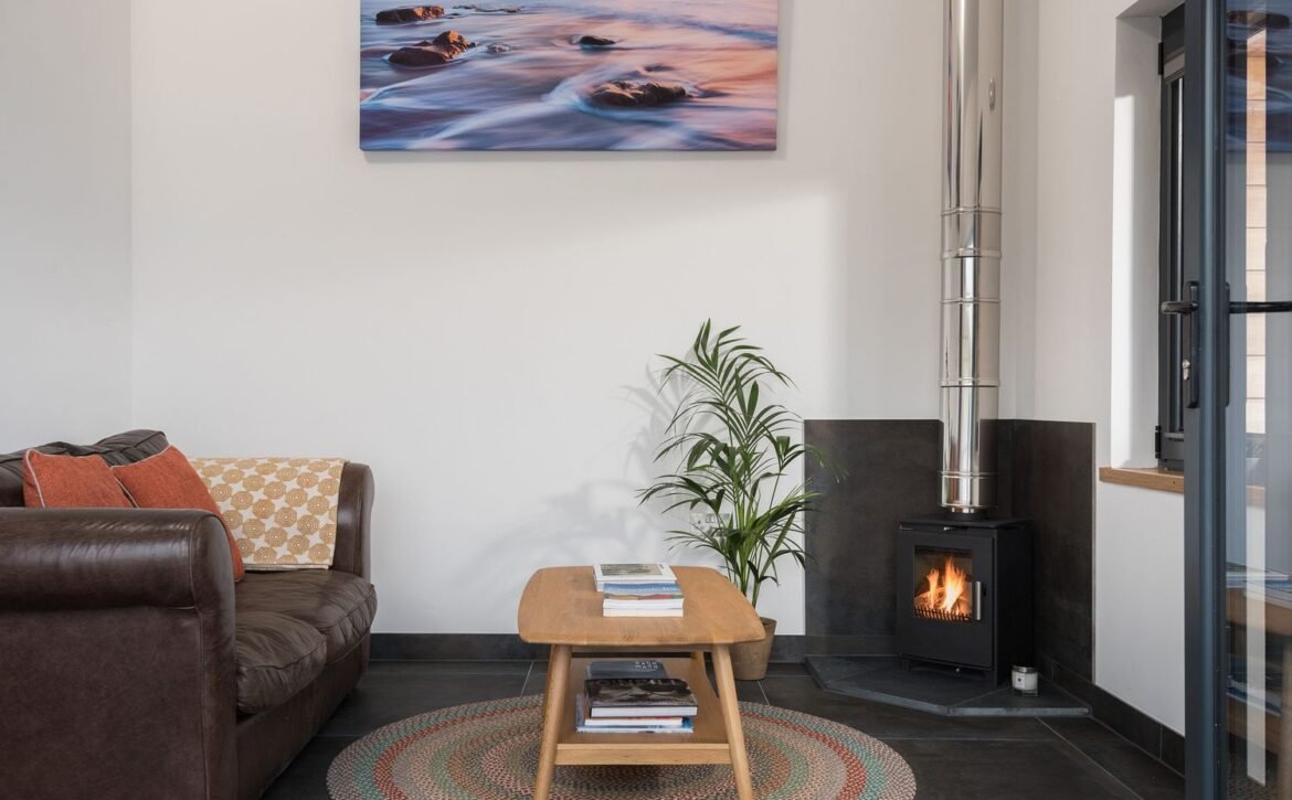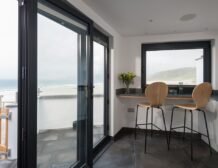Over in the sitting area you can find a woodburning stove takes a central position before the inviting leather sofa, a perfect spot to wind down in when day turns to evening, and on summer days open up the bi-fold doors to let the outside in and feel the fresh Atlantic breeze.