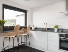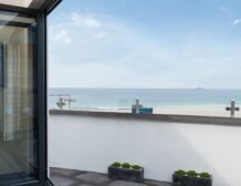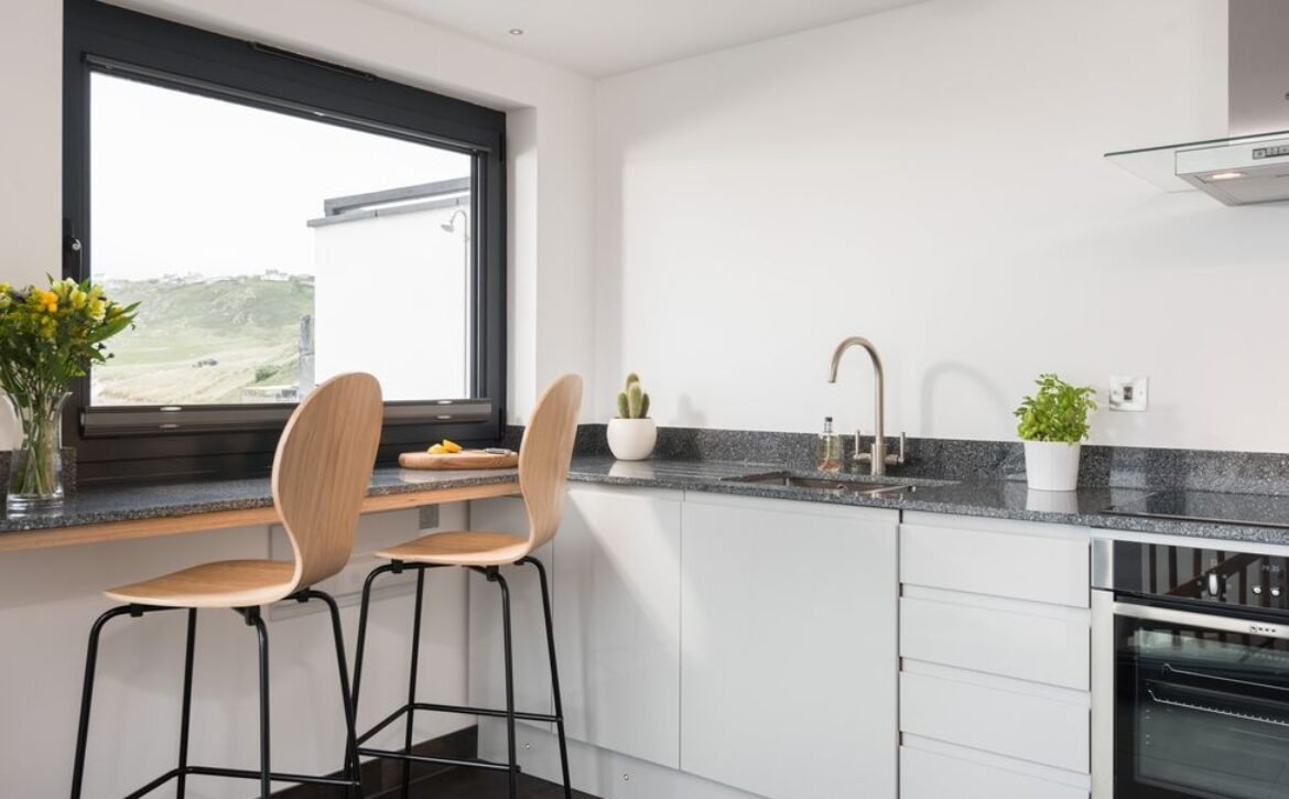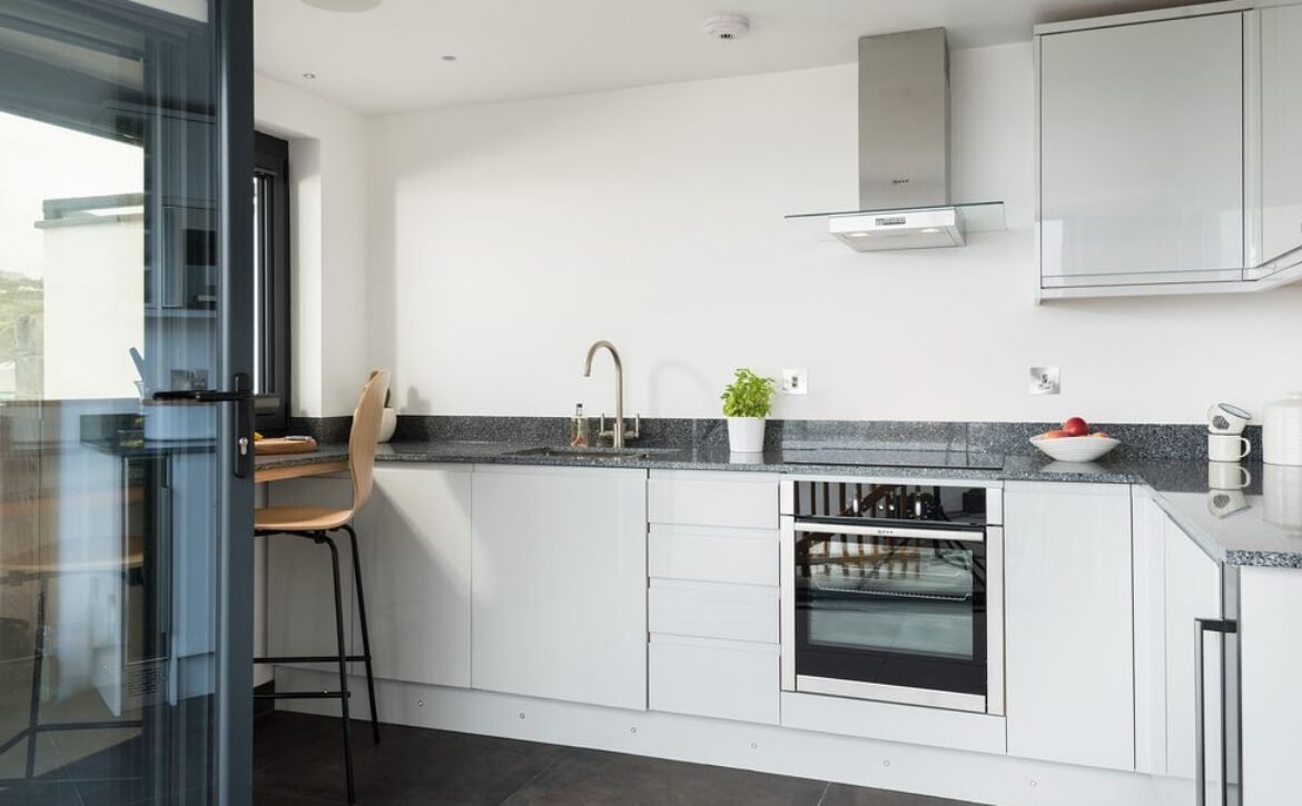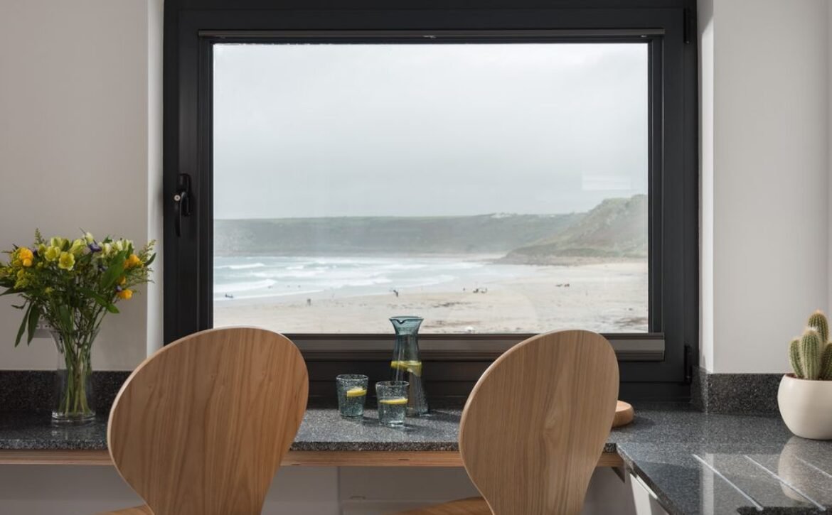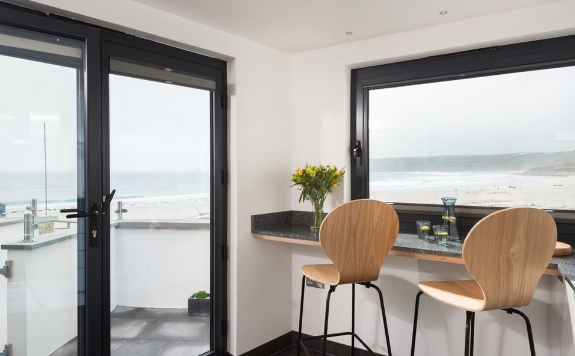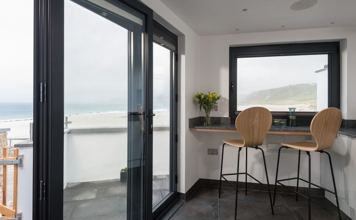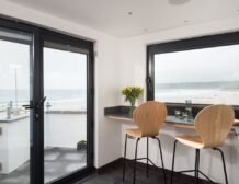 Enter into this contemporary style home and discover first the kitchen and dining area, where sleek pale grey units hold all the appliances you need including a slim dishwasher carefully tucked away, with a breakfast bar sat beneath the window overlooking the beach for some beautiful breakfast views to wake up to.