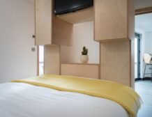 - One double bed within open-plan studio layout, with kitchen, dining area and sitting area with woodburning stove