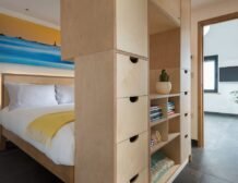 Find the double bed behind a cabinet acting as a partition between this space and the rest of the property, while next door there is the fully tiled shower room with an indulgent rainfall shower head.