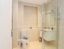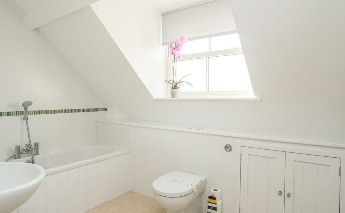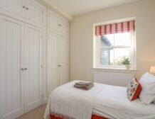 The kitchen has an oven and hob, fridge / freezer, dishwasher, microwave, toaster and plenty of pots, pans, crockery and utensils. French windows lead to the balcony which has lovely views and garden furniture. The rear hallway has a door opening to the garden with a footpath down to the water’s edge. A second cosy sitting room has two sofas and large, flat screen Smart TV and DVD player. The washing machine is house in a cupboard in the front hall. There is a ground floor twin bedroom and shower room with large shower cubicle, loo, wash hand basin and heated towel rail. Upstairs there is the master bedroom with king size bed and en-suite shower room with shower, loo, wash hand basin and heated towel rail.