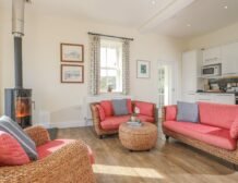 The living area has cane sofas and chairs and a wood burning stove with a dining table and chairs to seat 8 comfortably.