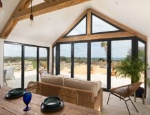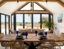 The open-plan living space offers everything you need for a self-catering stay, from a modern well-equipped kitchen for cooking up your favourite meals to a dining area and sitting area with a contemporary, flame-effect electric fire and bifold doors to take in the stunning sea views.