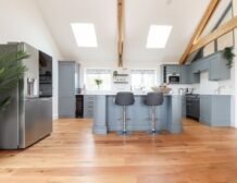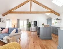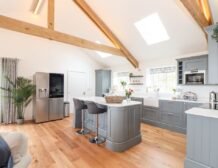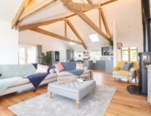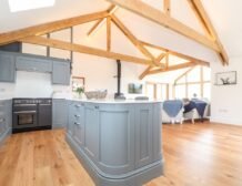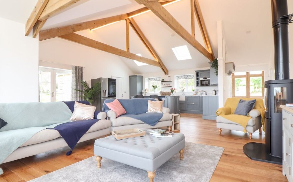 - Open-plan living space with kitchen, dining area and sitting area with woodburning stove