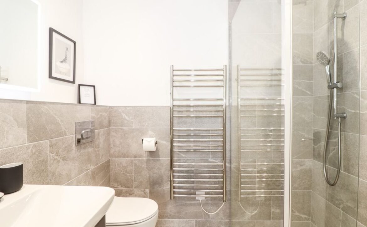 - Shower room with walk-in shower, basin, heated towel rail and WC