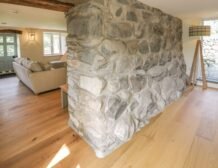 Gather around the beautiful dining table with stylish feature lighting above and a feature made of the exposed stone in the wall, you can enjoy the elegant mix of rustic and contemporary style.