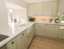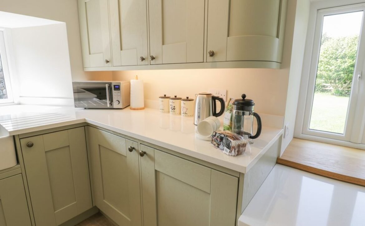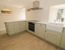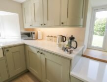 The stunning olive green fitted kitchen will surely tempt anyone to get cooking, with a host of integrated appliances to use including an electric oven and a five-ring induction hob, as well as plenty of preparation space on the white quartz surfaces.