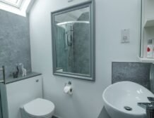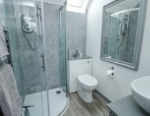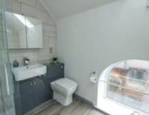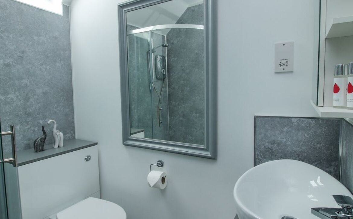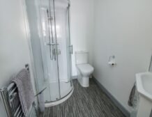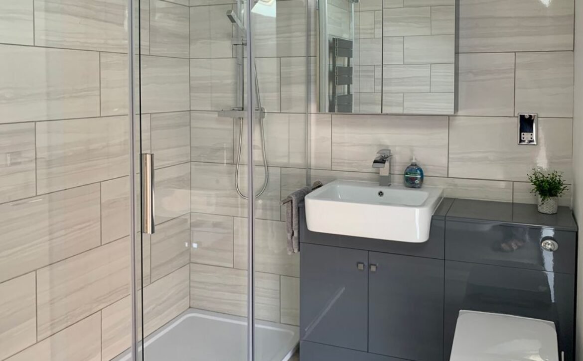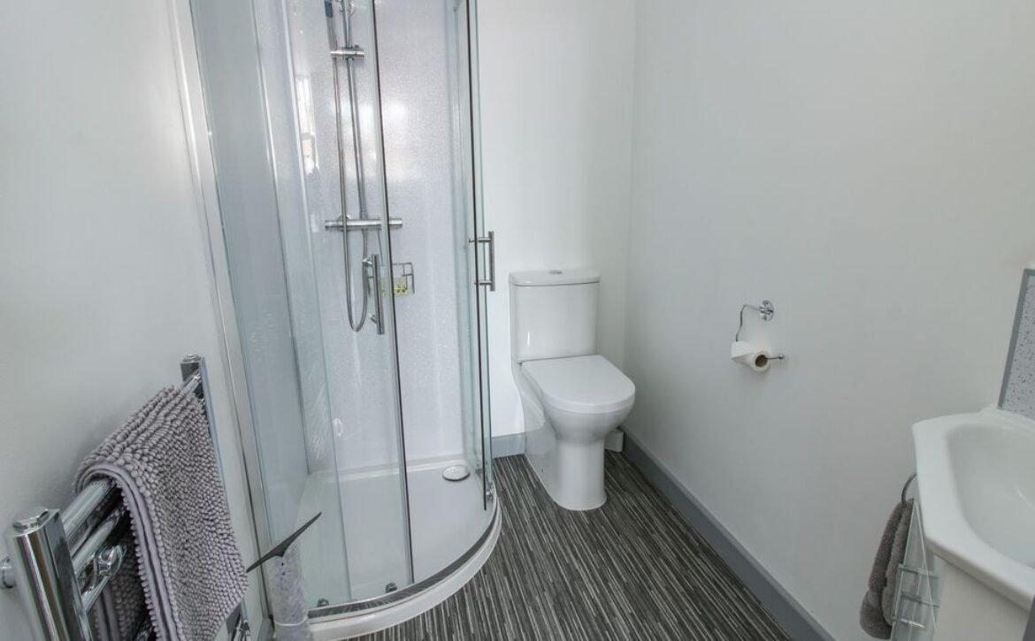 - Ground-floor shower room with walk-in shower, basin, and raised WC
