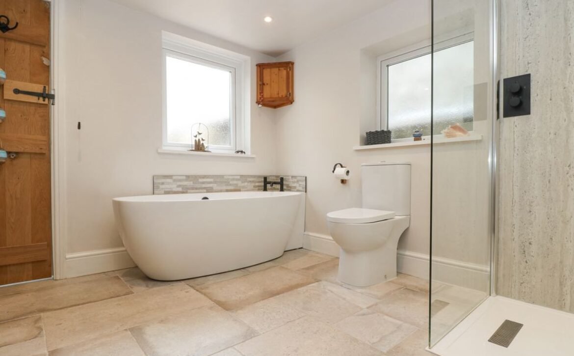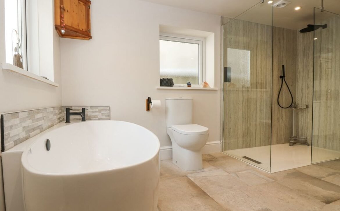 - Ground-floor bathroom with bath, walk-in shower, basin and WC