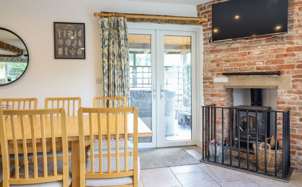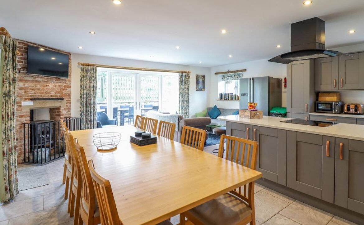 - Open-plan living space with kitchen, dining area and sitting area with woodburning stove