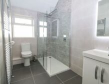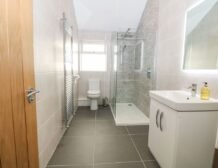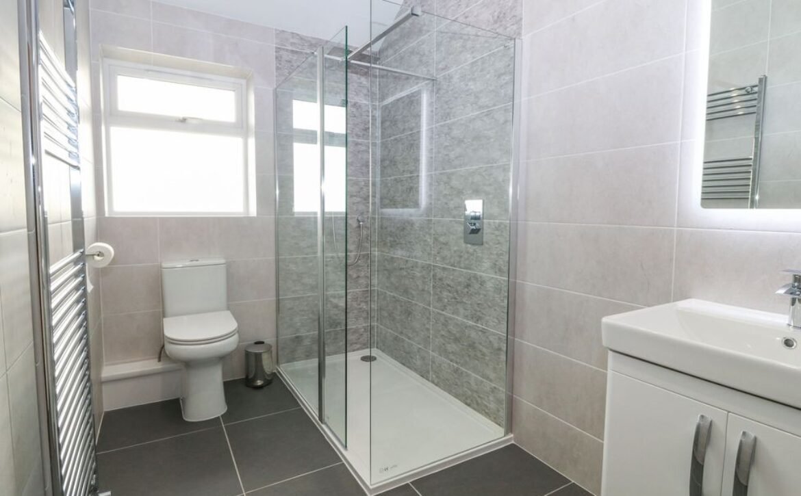 - Shower room with walk-in shower, basin, heated towel rail and WC